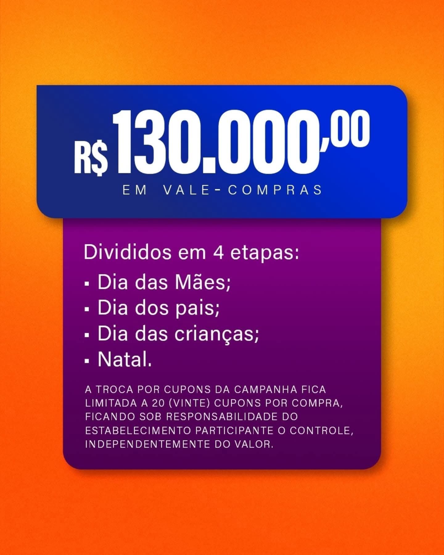 O consumidor a cada R$ 50,00 em compras, ganha um cupom para concorrer a vales-compra, sendo que as empresas participantes, também serão premiadas.