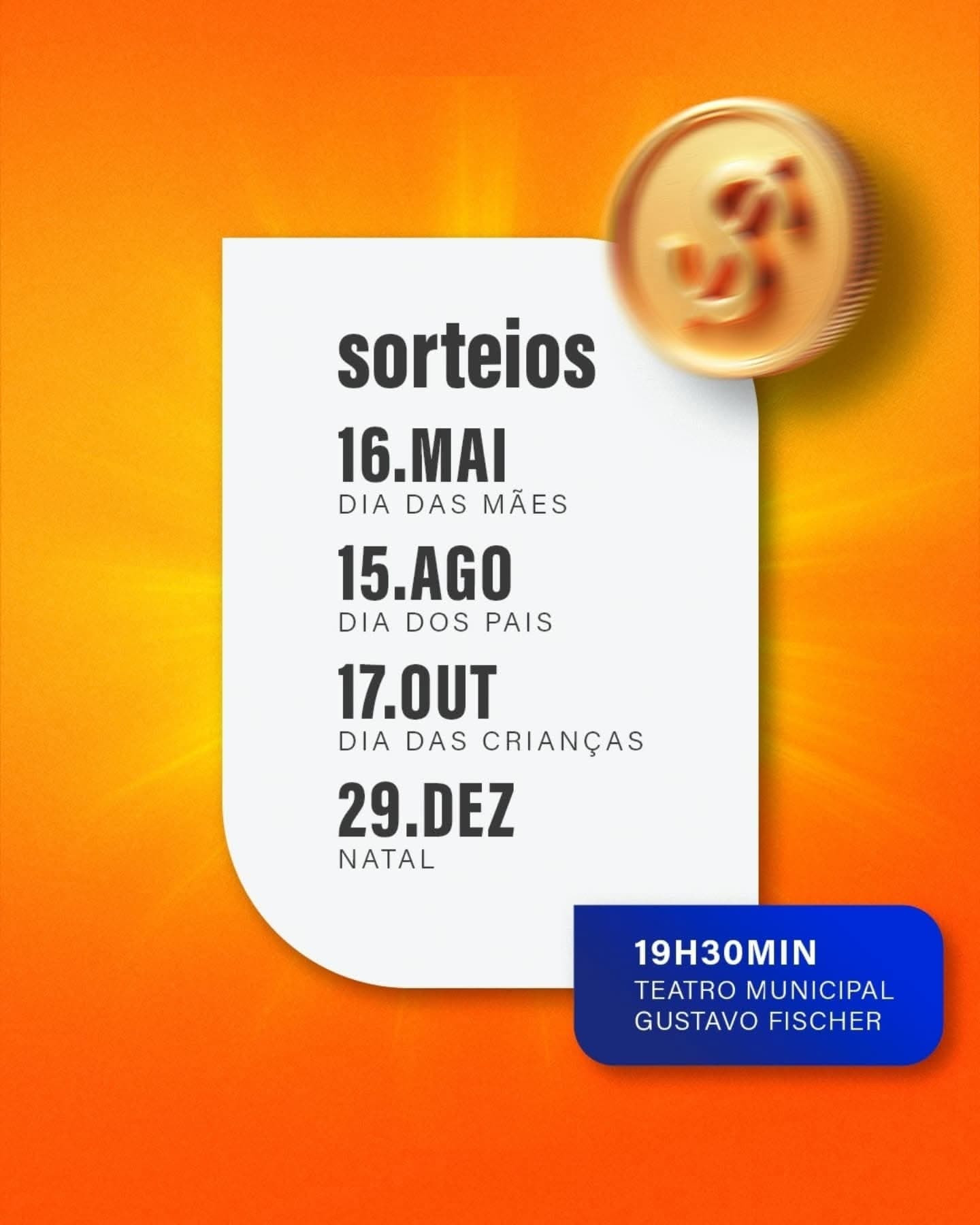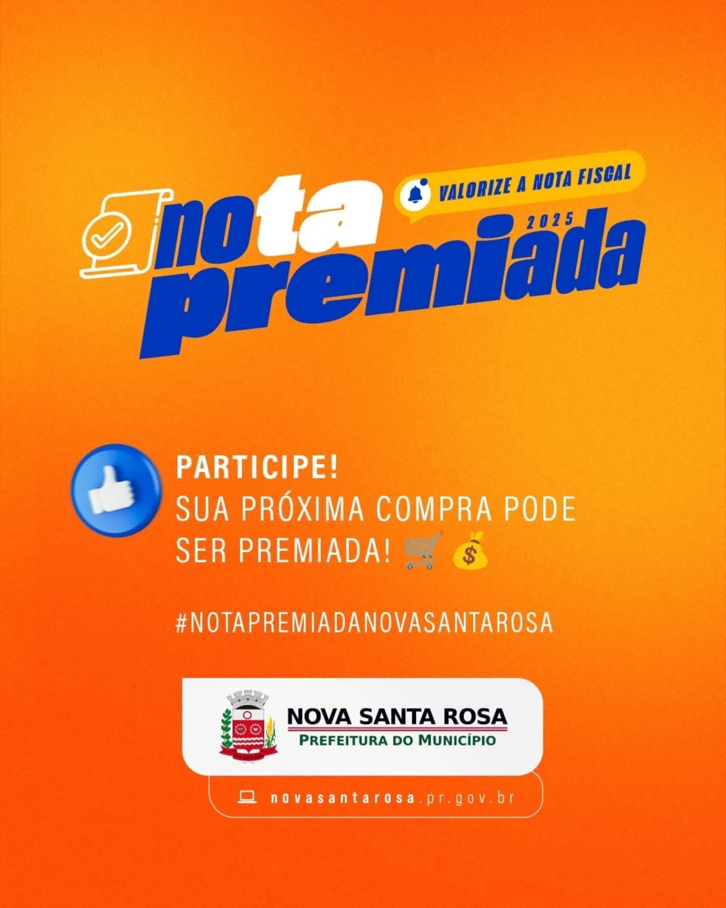A Prefeitura de Nova Santa Rosa, por meio da Secretaria de Indústria, Comércio e Turismo, informa que o primeiro sorteio de 2025 da Campanha Nota Premiada – Valorize a Nota Fiscal, compre no comércio de Nova Santa Rosa e concorra a prêmios, ocorrerá no dia 16 de maio, alusivo ao Dia das Mães. Haverá ainda sorteio do Dia dos Pais, Dia das Crianças e Natal.