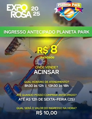 Começa a venda de ingressos para o parque de diversões da Expo Rosa 2025 Expo Rosa 2025 15/04/2025 13:52 | Atualizado há 9 meses atrás Começa a venda de ingressos para o parque de diversões da Expo Rosa 2025 (Foto: Reprodução)